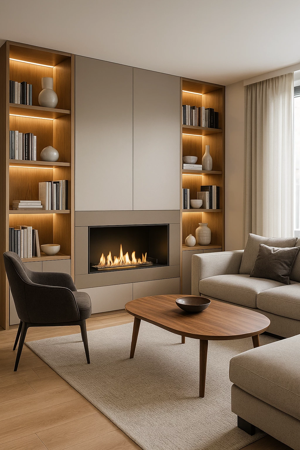 Un mueble de salón con chimenea de bioetanol es mucho más que una pieza decorativa. Como en la imagen que te mostramos, puedes integrar una chimenea empotrada dentro de una estructura a medida con estanterías, puertas o módulos decorativos. El resultado: un conjunto armónico que combina almacenamiento, diseño y calidez. Ideal para crear un rincón de lectura acogedor o el centro visual del salón.