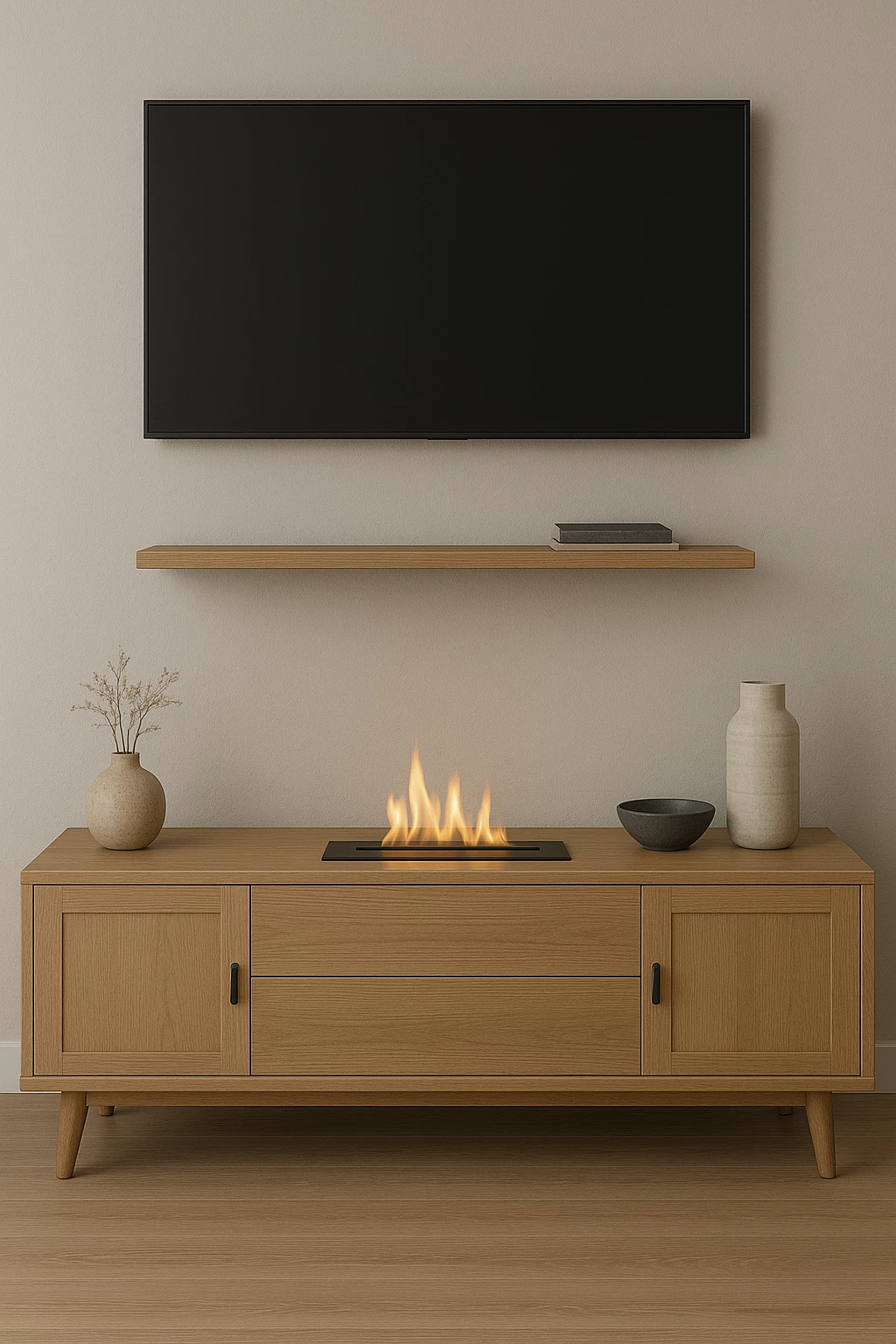 A la hora de llevar a cabo el diseño de cualquier mueble de tv con chimenea de bioetanol, es importante tener en cuenta las distancias mínimas de seguridad entre la llama y el televisor, especialmente si se encuentra justo encima de la chimenea. No dejes de consultar nuestra guía sobre cómo instalar un televisor sobre una chimenea de bioetanol de manera segura para saber más al respecto.