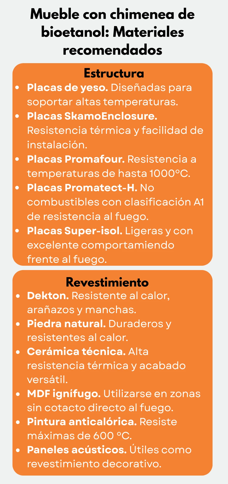 Recomendación técnica: Antes de diseñar cualquier mueble con chimenea de bioetanol, consulte las especificaciones técnicas del quemador a utilizar. Y no deje de consultar con un experto en carpintería o construcción para la elección de los materiales más adecuados para integrar una chimenea de bioetanol en un mueble.